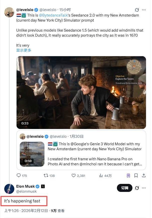 凤凰网科技讯 2月12日,近日,字节逾越视频模子Seedance 2.0火到国外。马斯克在其酬酢平台X转发辩驳Seedance 2.0联系推文,并暗意模子发展速率太快(It's happening fast)。