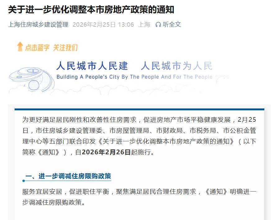 据上海住建委官微,为更好满足住户刚性和改善性住房需求,促进房地产商场安谨慎康发展,2月25日,上海市住房城乡建造措置委、市房屋措置局、市财政局、市税务局、市公积金措置中心等五部门相关印发《对于进一步优化治疗本市房地产战略的见知》(以下简称《见知》)体育游戏app平台,自2026年2月26日起履行。