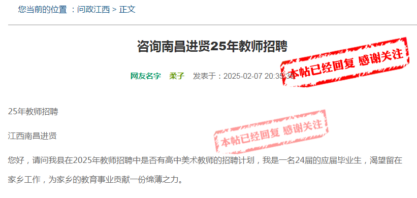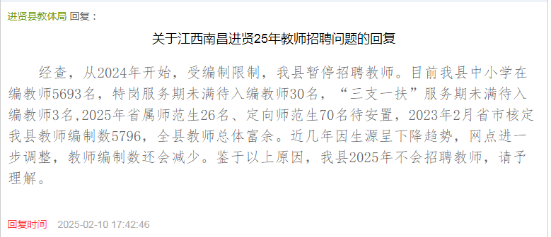 本年2月,有网友在“问政江西”留言参谋南昌进贤县西宾招聘情况。该县教体局留言复兴:受编制圆寂,自2024年起,该县暂停招聘西宾。