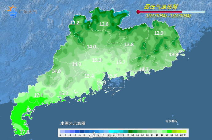 8日,我省西部市县多云到阴天,有溜达小雨,其余市县多云间晴。最低气温:粤北和珠江三角洲北部市县8~11℃,粤西沿海市县13~15℃,其余市县11~13℃。