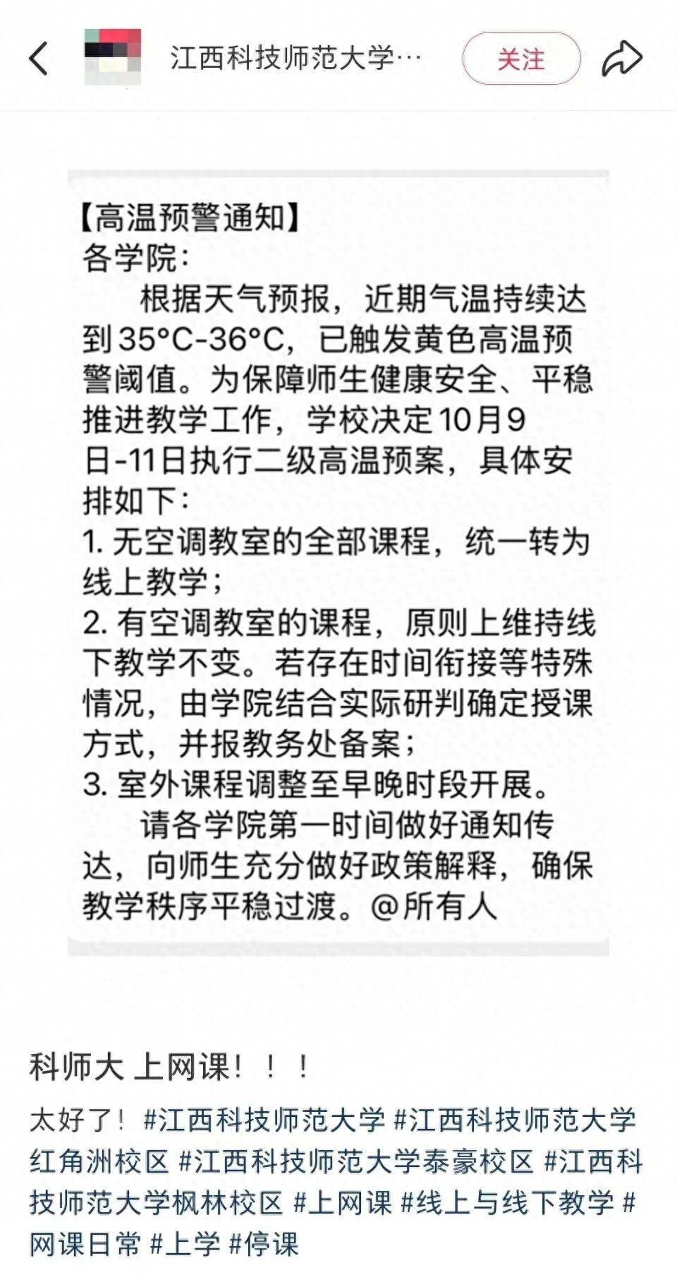 就读于江西科技师范大学的又名学生示意,该校发布了高温预告诫知,10月9日到11日实行二级高温预案,全校区无空调教室的一说念课程,斡旋瞥为线上教悔;有空调教室的课程,原则上保管线下教悔不变;室外课程转念至旦夕时段开展。