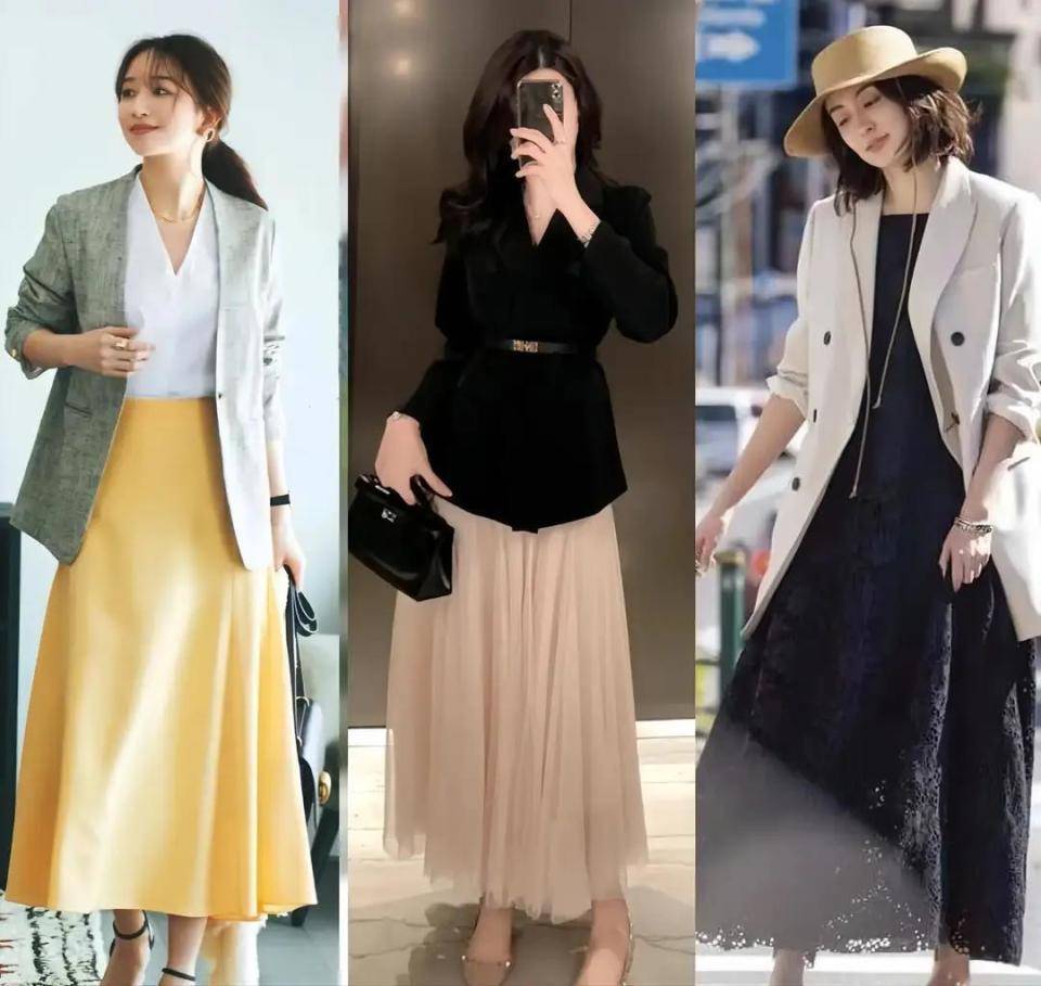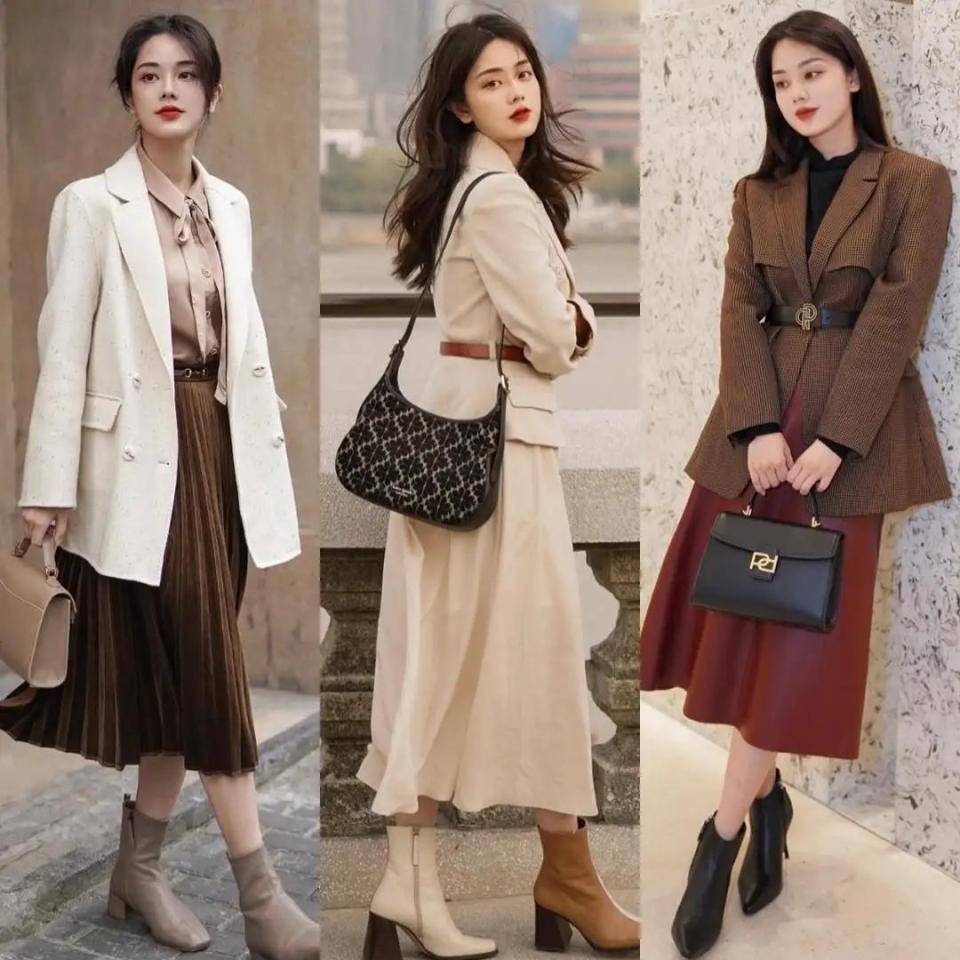 职场女性,我们思让我方的造型更干练,这时刻推选你礼聘底下这种白色的西装外衣,驼咖色的西服外衣,搭配上一件赤诚衫,概况是衬衫,下半身不错凯旋礼聘伞状名堂的半身裙概况是a字半身裙,可是裙子长度一定要盖过膝盖到小腿肚的位置,也弗成过长,合适的通晓肌肤,这时刻智商搭配上短靴,裙子太长,把短靴盖住了,就会容易压身高。